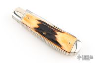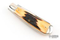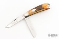 This slipjoint by Schatt and Morgan features two mirror finished blades with nail nicks. The handle features nickel silver bolsters, brass liners and stag covers. Steel springs. Has some light scratches, otherwise excellent condition.