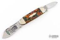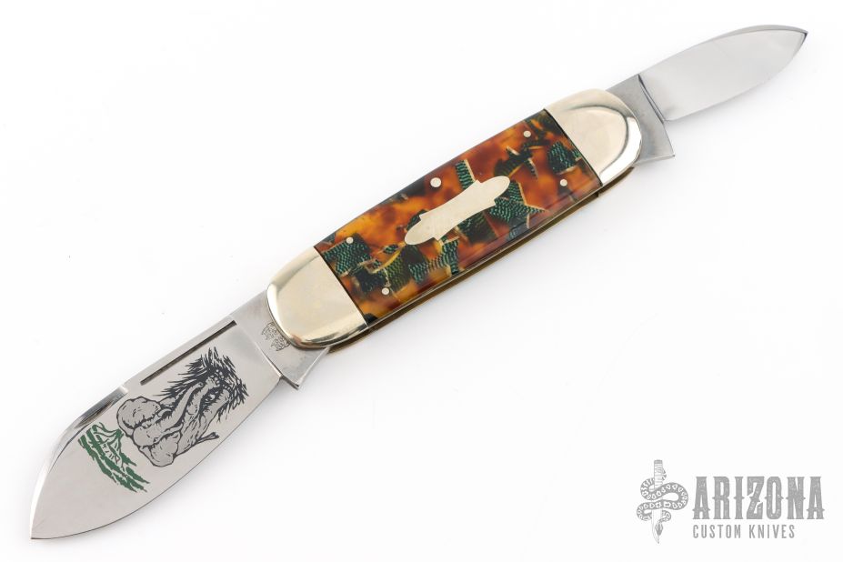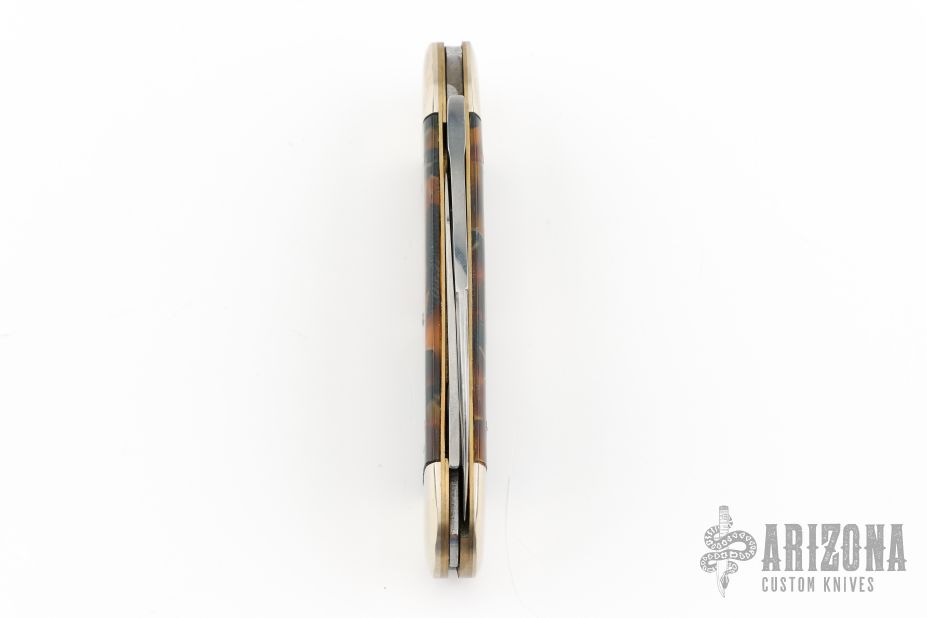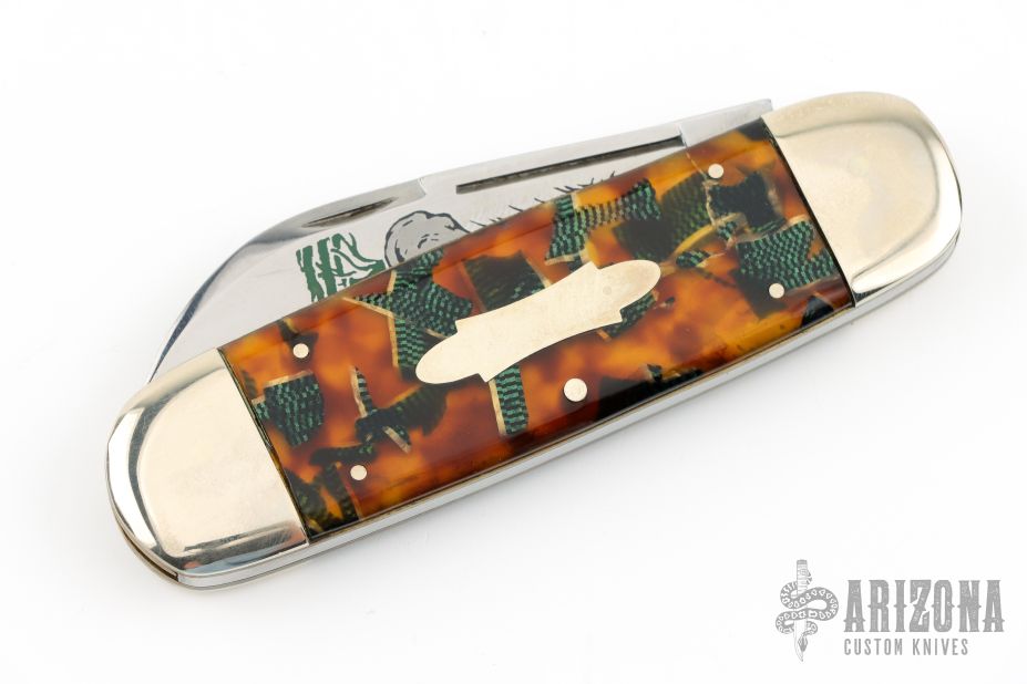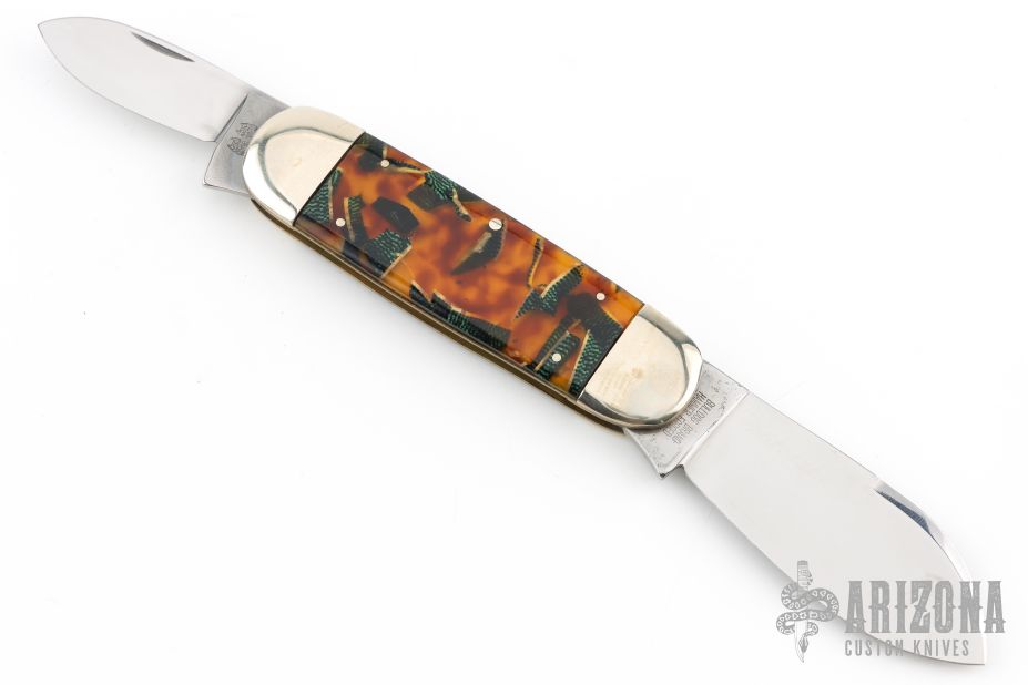 This Slipjoint from Bull Dog Brand Knives features polished blades with nail nicks. The handle has nickel silver bolsters, acrylic covers over brass liners and stainless steel spring. Has a few light scratches, otherwise excellent condition. Marked prototype on the blade.