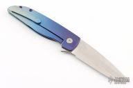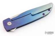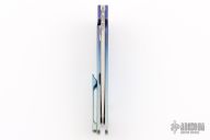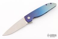 This Rask by John Grimsmo of Grimsmo Knives features a stonewashed blade with notched flipper. The handle has a smooth, stonewashed, and anodized titanium frame with matching tip up clip that has hidden screws, titanium barrel spacers and screws. Numbered #2737 on the spine of the blade. Includes original box and COA dated April 4, 2024. Excellent condition.