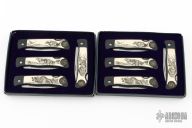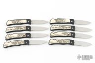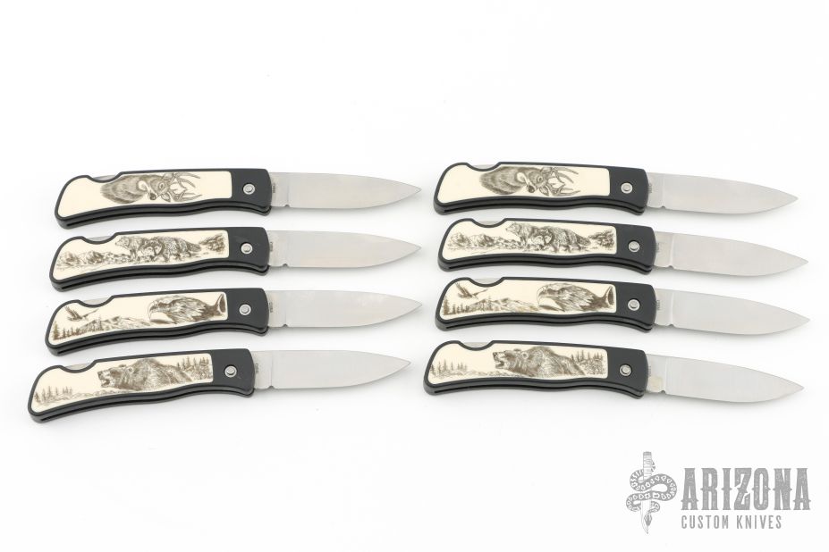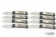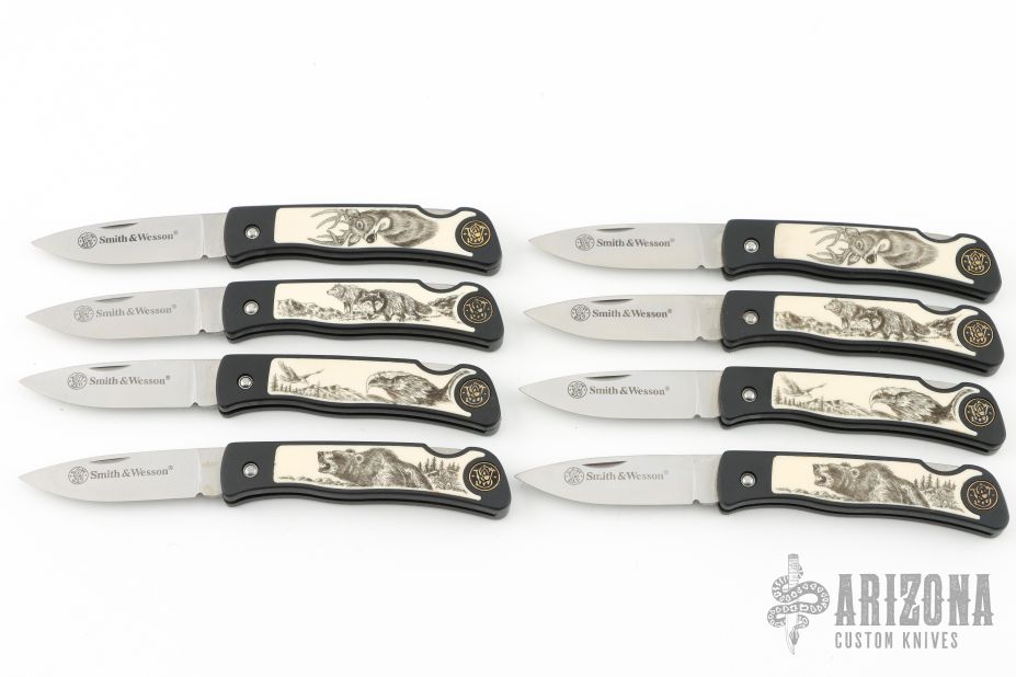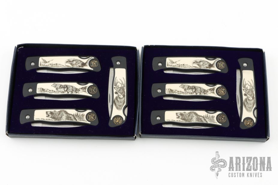 Artwork was created by world renown wildlife artist, Pam Essex. Includes 4 single-blade lockback pocket knives with scrimshaw inlay handles on both sides. Surgical steel blades etched "Smith & Wesson". With original box and certificate of authenticity. This listing is for a lot of 2 identical sets. Both in excellent condition.