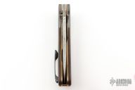 This Mini Notorious by Gerry McGinnis features a Dense Twist Damasteel blade with thumbhole and notched thumbrest. The handle has zirconium bolsters, green canvas micarta scales, anodized and lightly orange peel finished titanium liners and backspacer, tip up ZircuTi clip. Nice detent, lockup and blade seating. Comes with leather zippered case and COA dated 1-23-19. Dated TKI 2019 and #030 on the inside of the frame. Has some scuffs and scratches, great condition otherwise.