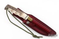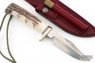 This Stanaback Special features a satin finished blade with sharpened top edge and notched thumbrest, .210" blade thickness and 1.128" blade depth, hidden tang construction. The handle has a nickel silver guard and butt, finger groove stag grip with black/duralumin spacers. Includes a maroon leather sheath with sharpening steel. Excellent condition.