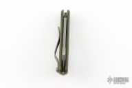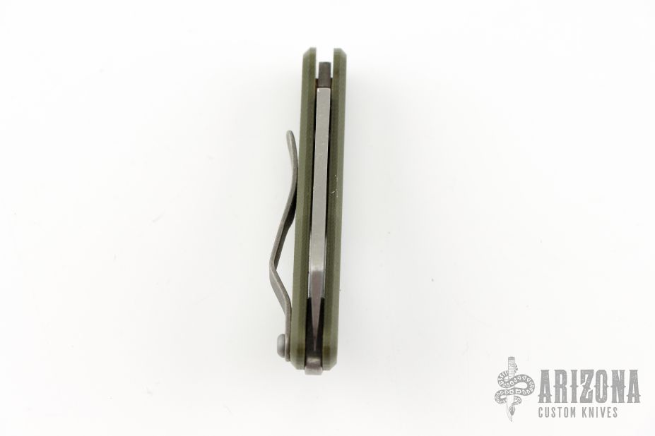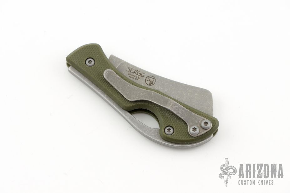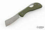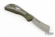 This production slipjoint folder by Serge Panchenko features a stonewashed, M390 cleaver blade. The handle is stonewashed titanium and olive drab green G10 with a tip up clip. Has a halfstop, flush in all positions. Comes in original packaging. Excellent condition.