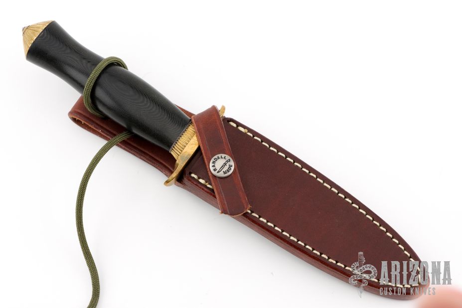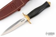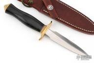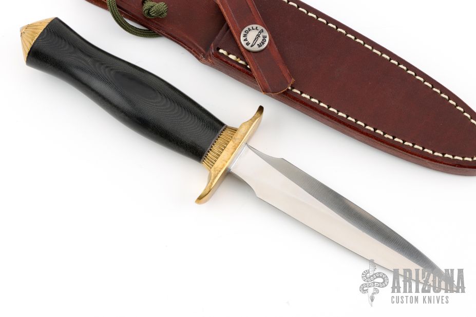 This Model 2-5 Dagger by Randall Made Knives features a double-edged satin finished blade with .154" stock and .903" blade depth, hidden tang construction. The handle has a brass guard and scalloped butt cap, black linen micarta grip. Comes with a leather sheath. Excellent condition.