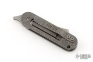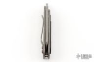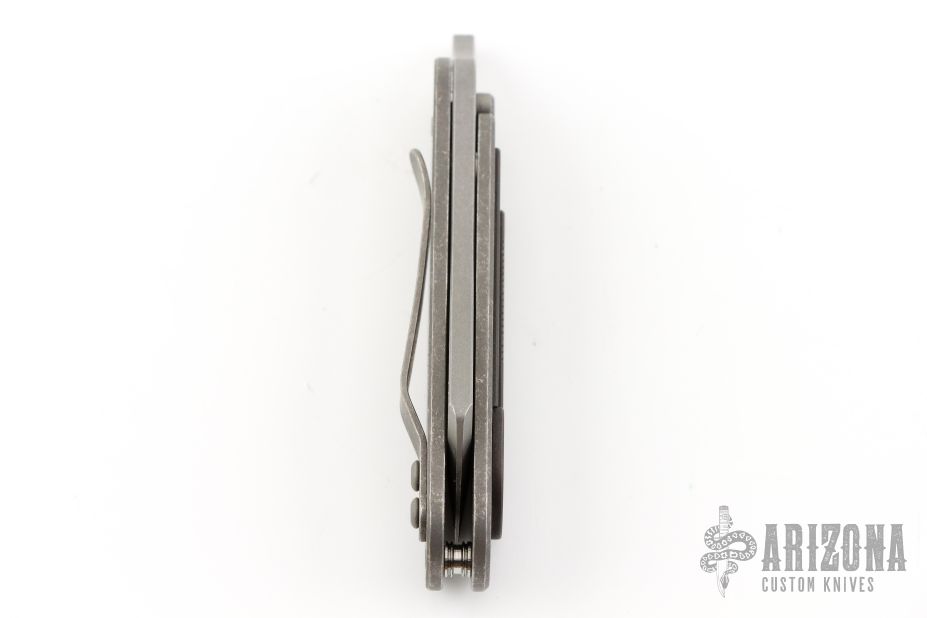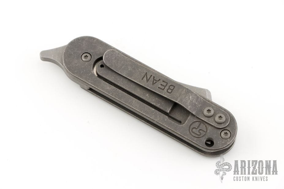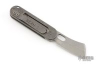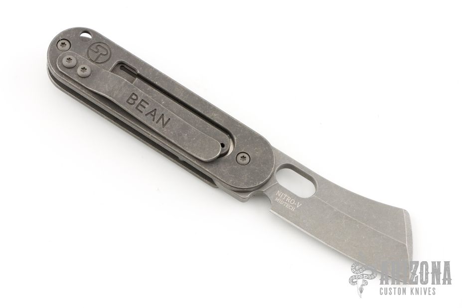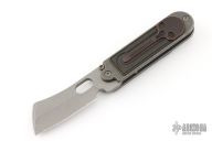 This midtech Bean Cleaver folder by Serge Panchenko features a stonewashed, Nitro-V, cleaver style blade with front flipper/friction bar and thumb hole. The handle is stonewashed titanium with a tip up clip and brass and copper skull inlay. Has a detent to hold the blade in position open/closed, but it does not lock. Comes with maker's card. Has a couple light scuffs on the blade. Excellent condition.