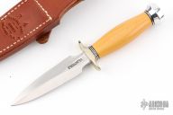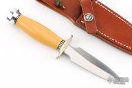 The Model 2 by Randall Made Knives is a heavily made dagger or dirk. This knife has a 4" satin finished stainless steel double edged blade, .167" blade stock and .967" blade depth, hidden tang construction. The handle has a nickel silver guard, and yellow paper micarta grip with duralumin/black spacers, dualumin butt. Includes a brown leather sheath. Excellent condition.