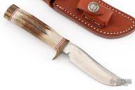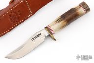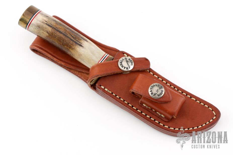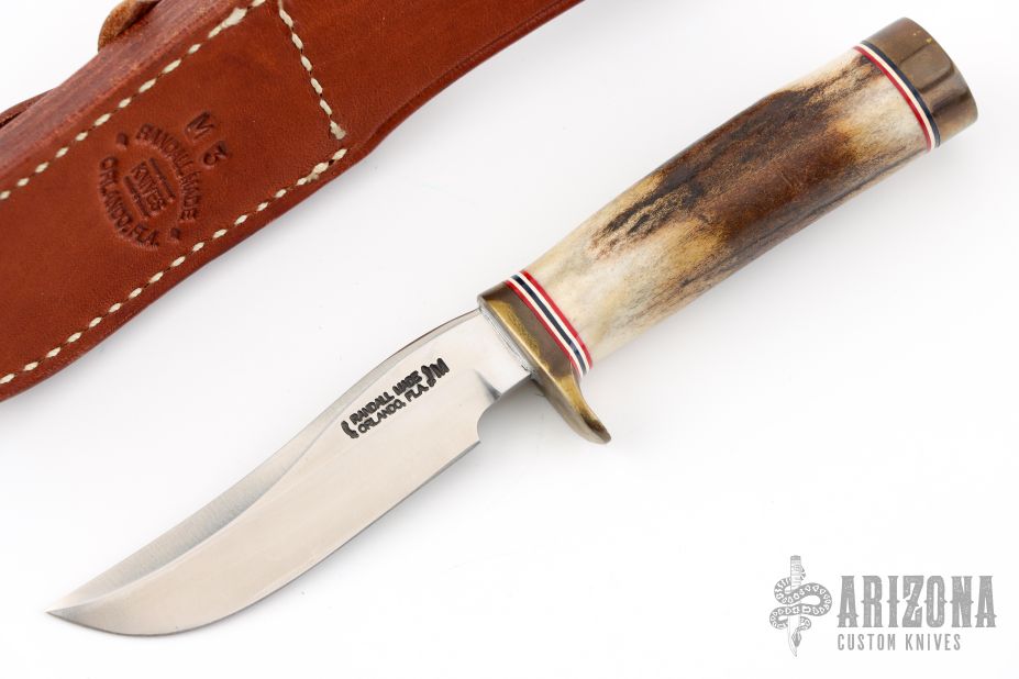 This Miniature Model 3 Hunter by Randall features a stainless steel blade with false top edge, .164" blade stock and .798" blade depth, hidden tang construction. The handle has a brass guard and butt, and stag grip with red/white/blue spacers. This knife is part of a limited edition and is numbered 730. Comes with a brown leather sheath. Excellent condition.