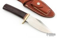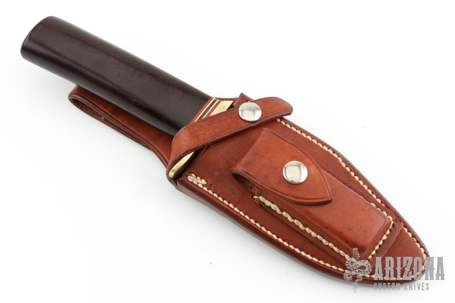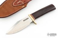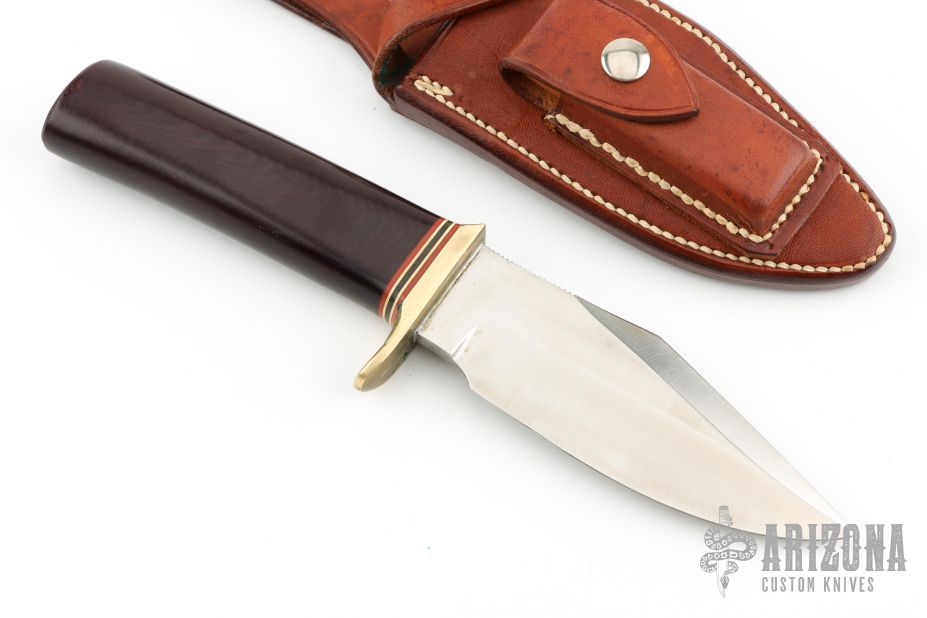This knife has a satin finished stainless steel blade, with sharpened top edge and a notched thumbrest, .230" blade stock and 1.695" depth, hidden tang construction. The handle has brass guard and a black linen micarta handle with red/white/blue spacers. Comes with brown leather Johnson Roughback sheath with stone. Has a couple light scratches, otherwise excellent condition.