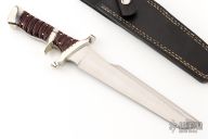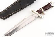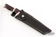 This knife by Bob Sky features a satin finished clip point blade with sharpened top edge, .246" blade stock and 1.499" blade depth, full tapered tang construction. The handle has nickel silver guard and butt, fluted burgundy paper micarta scales, fileworked nickle silver liners and pins. Comes with a leather belt sheath. Has some light scratches, otherwise Excellent condition.