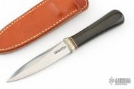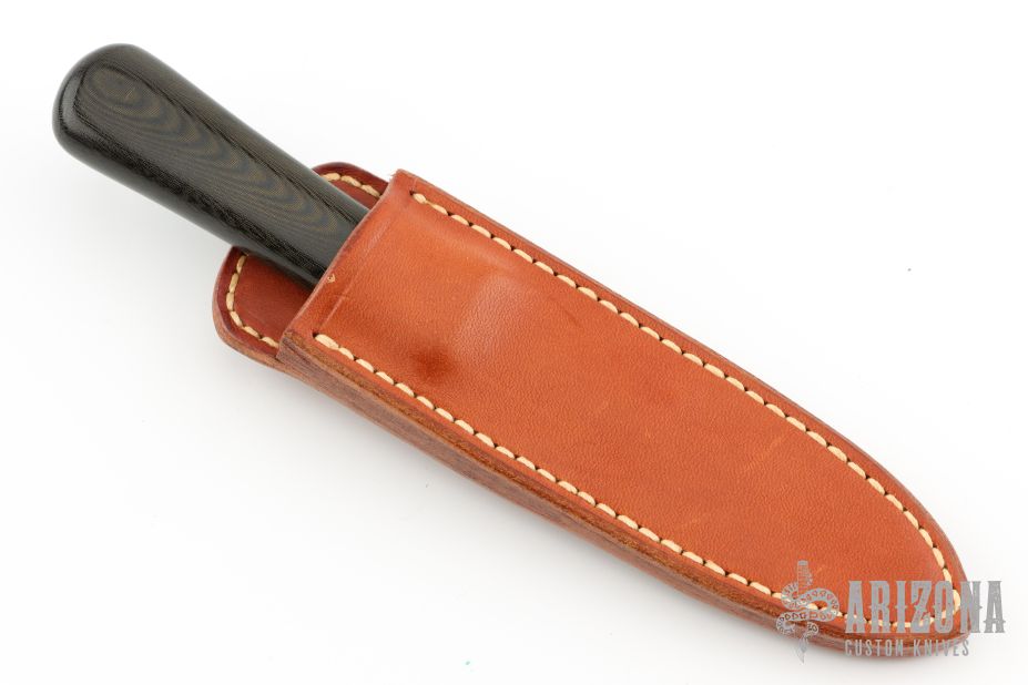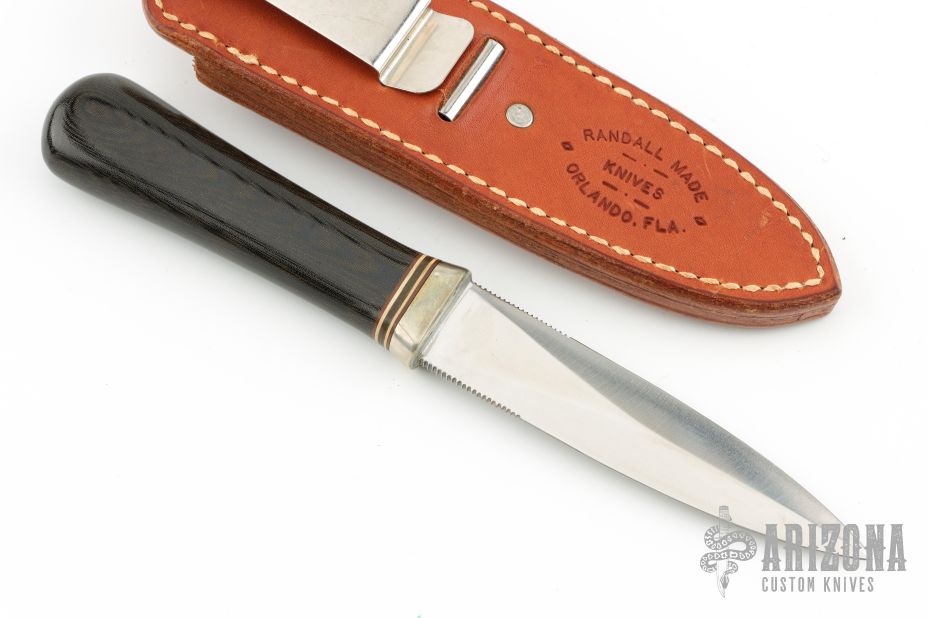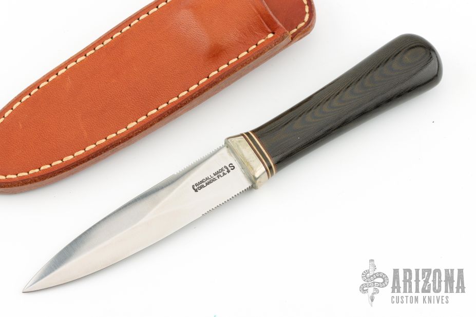 This Model 24 Guardian by Randall Made Knives features a satin finished double-edged blade with notched finger rests, .125" blade stock and .857" blade depth, hidden tang construction. Black linen micarta grip with red/white/blue spacers and a nickel silver guard. Both edges of the blade are sharpened with 1" of thumb notches. This model was designed in 1978 for use by police, undercover agents and law enforcement personnel for self-protection and as a back-up weapon. Comes with a brown leather sheath w/ boot clip. Excellent condition.