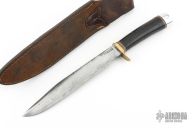 "The Model 1 by Randall Made Knives was made famous by Allied combat troops in World War II and has since been widely used in all theaters of war." This knife features a satin finished blade with a false top edge, .227" blade stock and 1.175" blade depth, hidden tang construction. Brass single guard, stacked leather handle with red/white/blue spacers, and a duralumin butt cap. Includes a brown button brown leather sheath. Has scratches and oxidation, has been resharpened, otherwise good condition for its age.