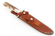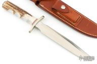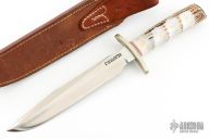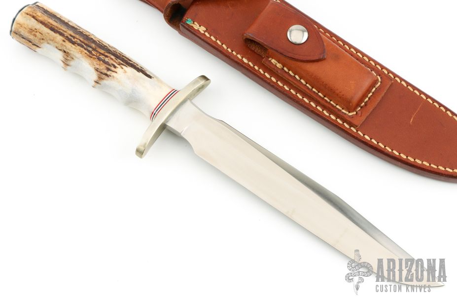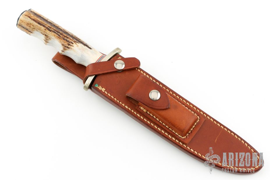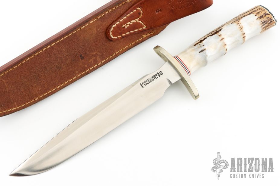 "The Model 1 by Randall Made Knives was made famous by Allied combat troops in World War II and has since been widely used in all theaters of war." This knife features a satin finished blade with a sharpened top edge, .215" blade stock and 1.180" blade depth, hidden tang construction. The handle has a forward curved nickel silver guard and butt plate, finger groove stag grip with red/white/blue spacers. Includes original brown leather sheath. Excellent condition.