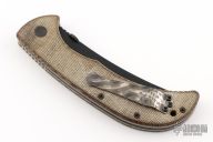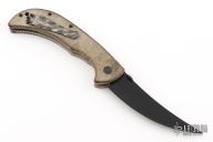 The Emerson P-Tac Persian features an upswept black blade, green micarta scales over titanium liners. Notches on thumbrest, lock, and rear of handle. Steel Flame steel clip. S/N 30 of 30. Includes the original box, papers and the original pocket clip. The tip has a small chip otherwise the knife is in Excellent condition.