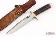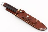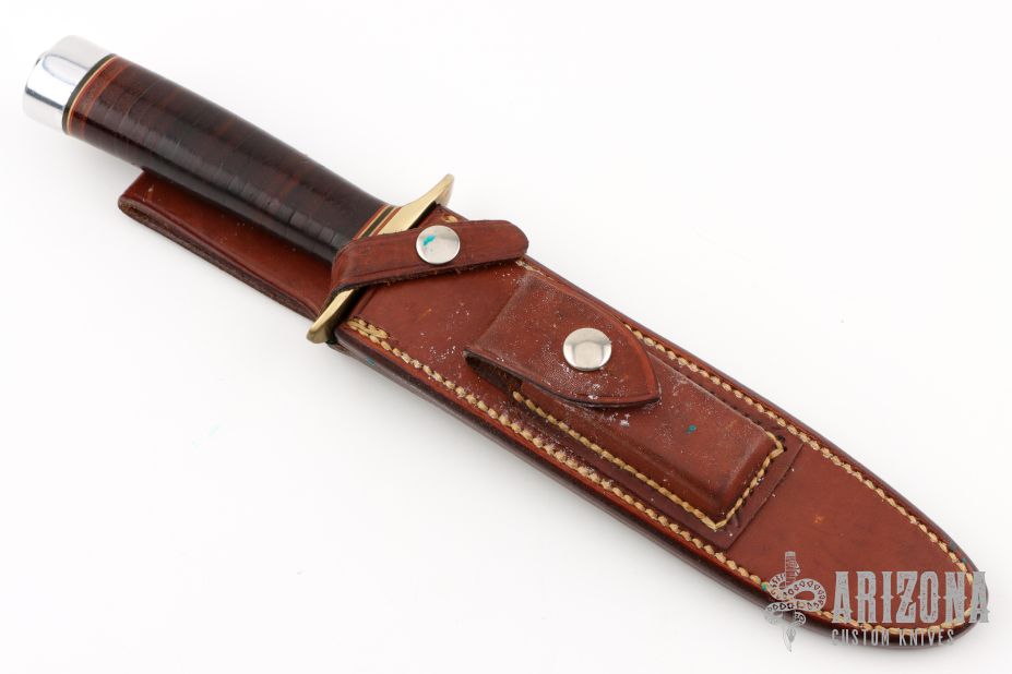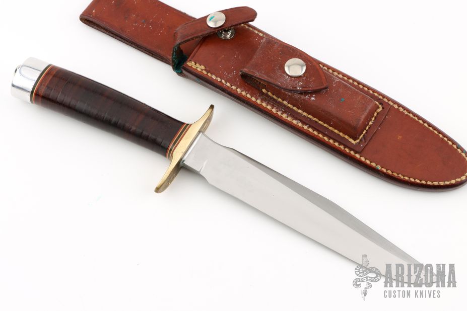 "The Model 1 by Randall Made Knives was made famous by Allied combat troops in World War II and has since been widely used in all theaters of war." This knife features a satin finished blade with a sharpened top edge, .227" blade stock and 1.115" blade depth, hidden tang construction. The handle has a brass guard and duralumin butt, stacked leather grip with red/white/blue spacers. Includes original Johnson Roughback brown leather sheath. Has a couple very light scratches, otherwise excellent condition.