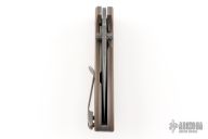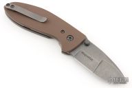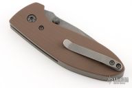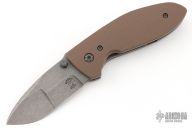 This Alpha by Tom Krein features an acid wash finished drop point, duplex ground blade with dual thumbstuds and a false top edge. The handle has brown g10 scales, tumbled titanium liners and tip up clip, titanium backspacer. Nice lock up, detent and blade seating. Includes a padded case. Excellent condition.