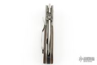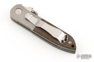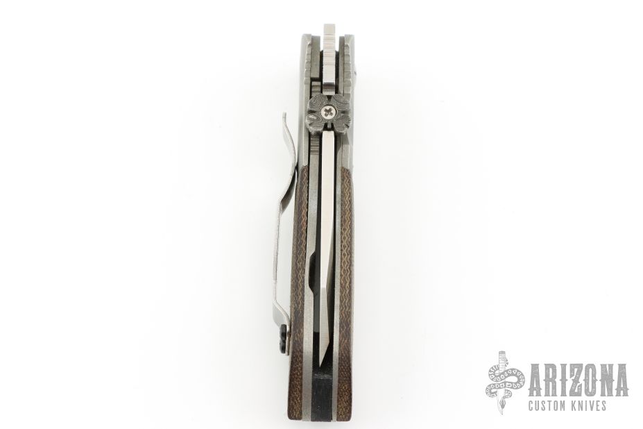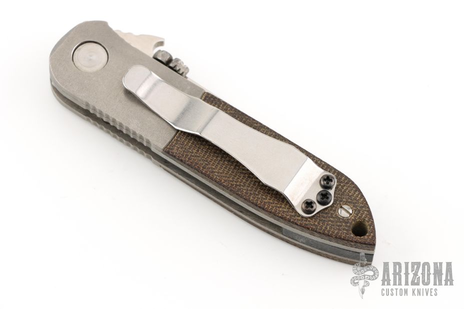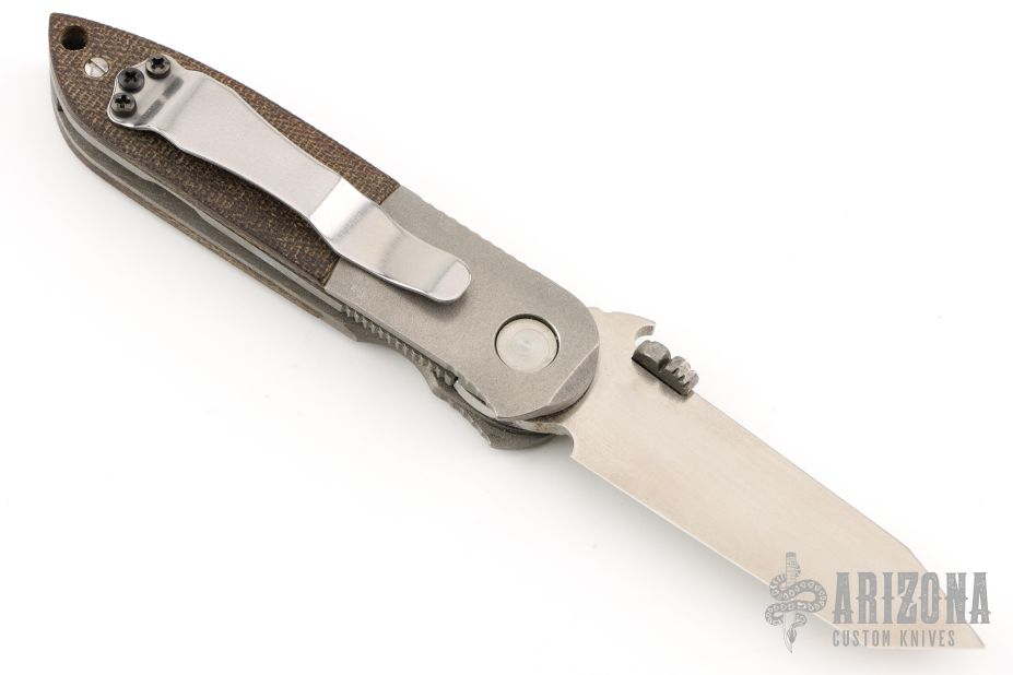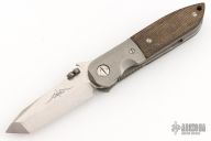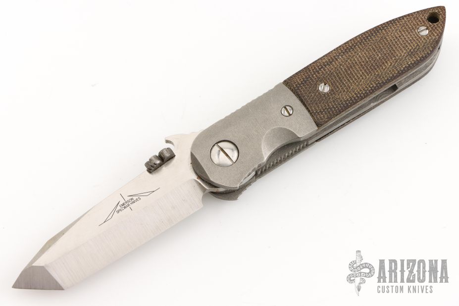 This Custom CQC-5 by Ernie Emerson features a satin finished tanto chisel ground blade with a custom Damascus Shamrock thumbdisc, wave feature and notched thumbrest. The handle has bead blasted and dovetailed titanium bolsters, green canvas micarta scales, bead blasted titanium liners, black G-10 backspacer, tip up stainless steel clip. Nice detent, lockup and blade seating. Comes with original box, thumbdisc and two extra black stainless steel clips and a set of clip screws. Has some light scuffs and scratches, otherwise excellent condition.