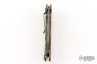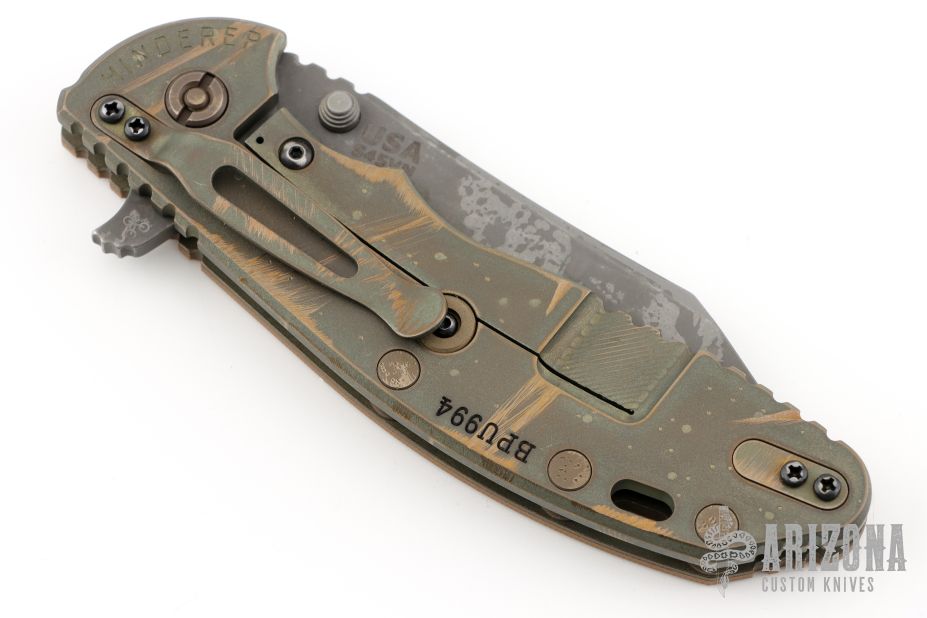 This Skinny XM-24 by Hinderer Knives features a distressed wharncliffe blade with notched thumbrest and flipper. The handle has a textured G-10 scale with tumbled titanium liner and frame, tip up or down reversible titanium clip. Comes with original box, cards, and extra washers. Excellent condition.