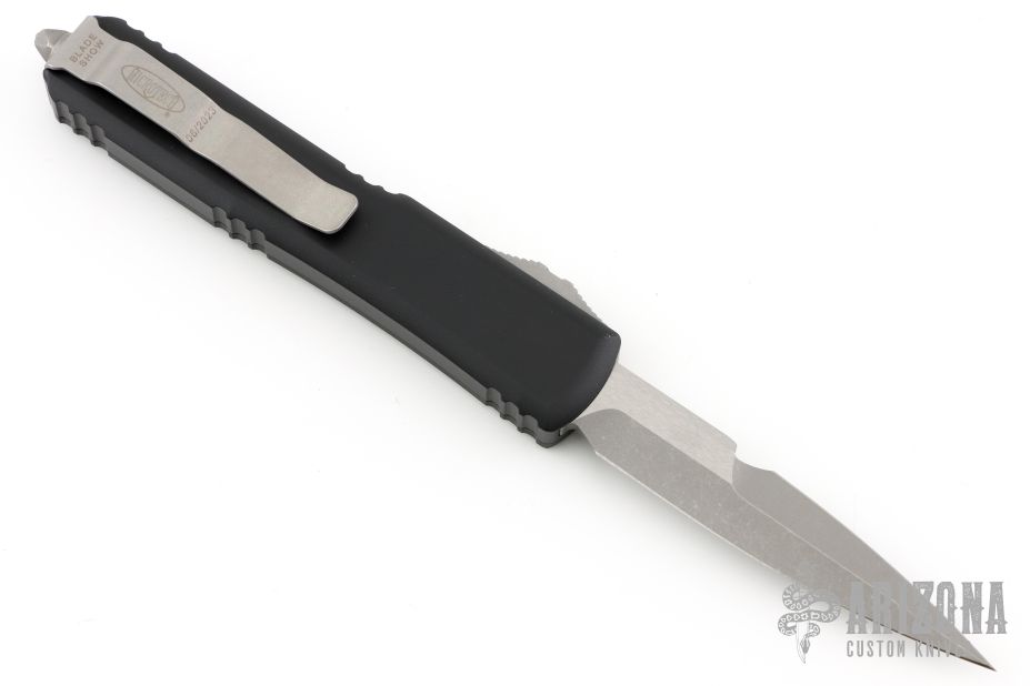 This knife from Microtech was the 2023 Blade Show Special. It has a double edged bayonet ground blade with an Apocalyptic finish. The handle is black frag pattern G-10 and black aluminum with a tip down Apocalyptic stainless clip and glass breaker at the butt. Comes with an original box and papers. Excellent condition. Dated 06/2023