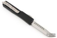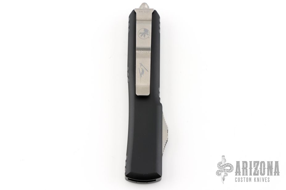 This Ultratech by Microtech Knives features a stonewashed Hellhound blade with satin flats and false top edge. The handle has a black aluminum frame with tip down blasted stainless steel clip and hardware. Comes with original box and papers. 10/2023, S/N 3221. Excellent condition.