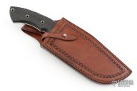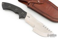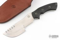 This WSK by Mark Terrell is bad ass! Features a satin finished blade with 4 sawteeth along the spine and a multi-ground blade, .218" blade stock and 2.301" blade depth, full tang construction. The handle has carbon fiber scales and a lanyard hole at the butt. Comes with a Paul Long hand tooled brown leather sheath. Excellent condition.