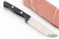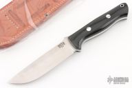 This Bravo-1.25 by Bark River Knives features a satin finished blade with notched thumbrest, .218" blade and 1.185" blade depth, full tang construction. The handle has black canvas micarta scales and aluminum pins. Comes with a brown leather sheath and original box. Excellent condition.