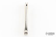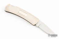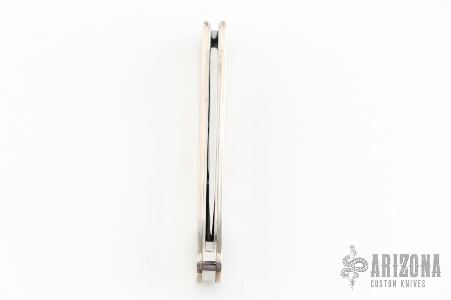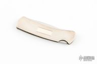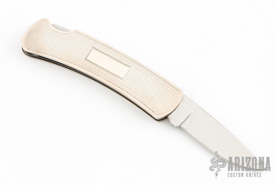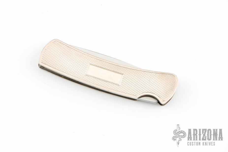 This 525 lockback by Buck Knives features a mirror polish finished drop point blade with nail nick. The handle is comprised of engraved nickel silver covers, with stainless liners, and spring. Comes with original clamshell box and papers. Has some light scuffs and scratches, excellent condition otherwise.