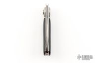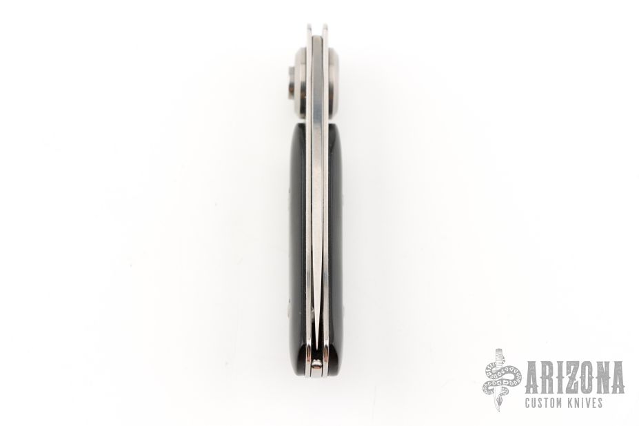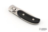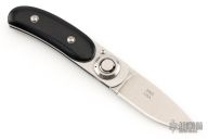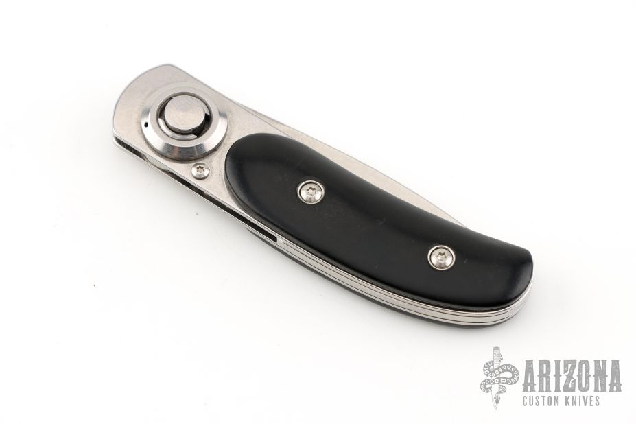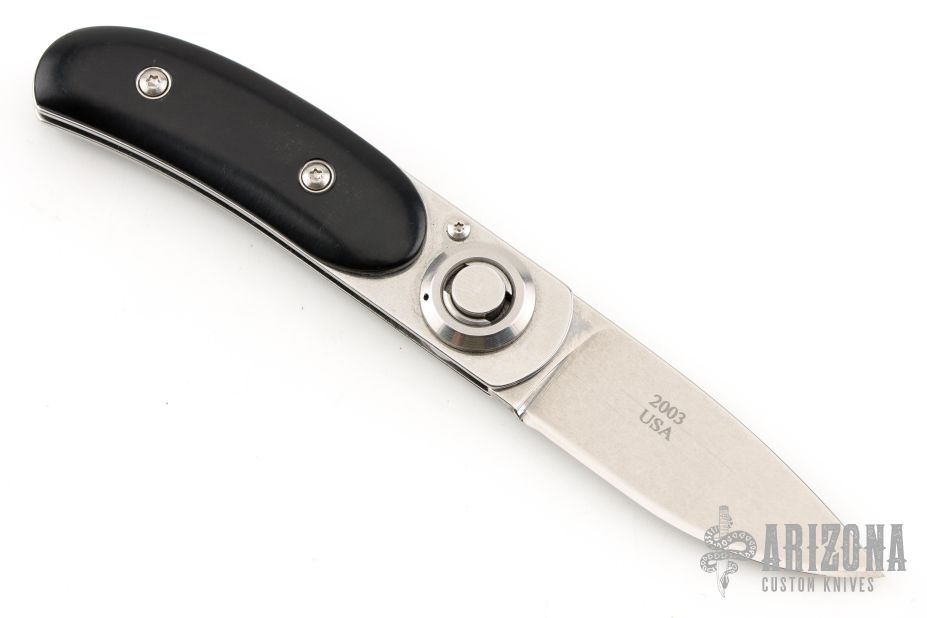 This Paul Pocket Knife features the Paul Poehlmann axial locking mechanism. Opens by depressing the button on the backside and rotating the face side dial. Closes the same way, rotating the dial in the opposite direction. The handle is comprised of black paper micarta scales over stainless steel liners and backspacer. Excellent condition.