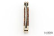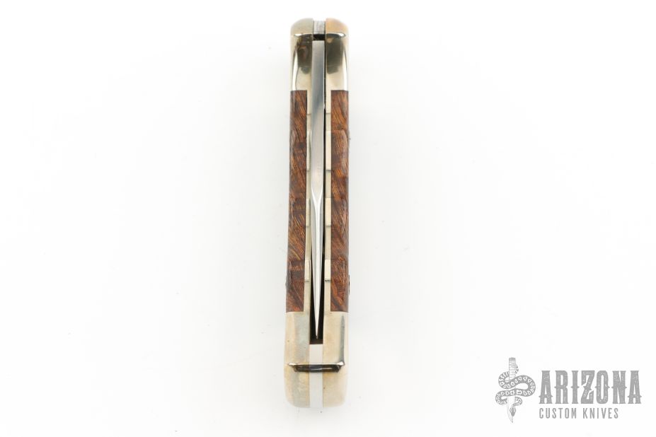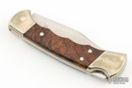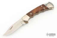 This Buck 112 features a satin finished clip point blade with nail nick. The handle has a nickel silver frame with ironwood scales and a stainless steel backspacer. Comes with original box, papers, and brown leather sheath. Excellent condition.