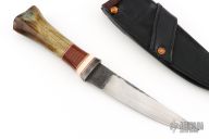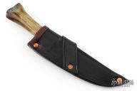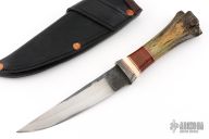 This forged Kwaiken from Master Smith Aaron Wilburn of Wilburn Forge features a forged blade with hamon, .208" blade stock and 1.188" blade depth, hidden tang construction. The handle has a blued steel guard guard, bone grip with red/nickel silver/bone/stacked leather spacers. Includes a black leather sheath with belt loop and a zippered case. Has some light scratches and patina, otherwise excellent condition. #534