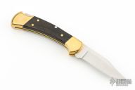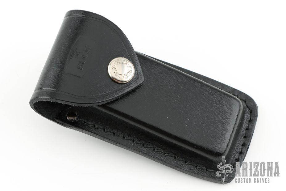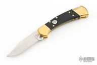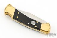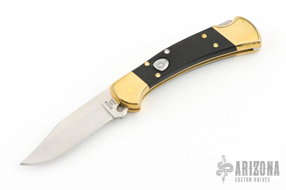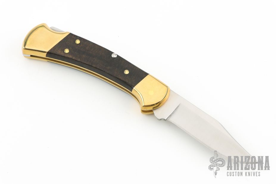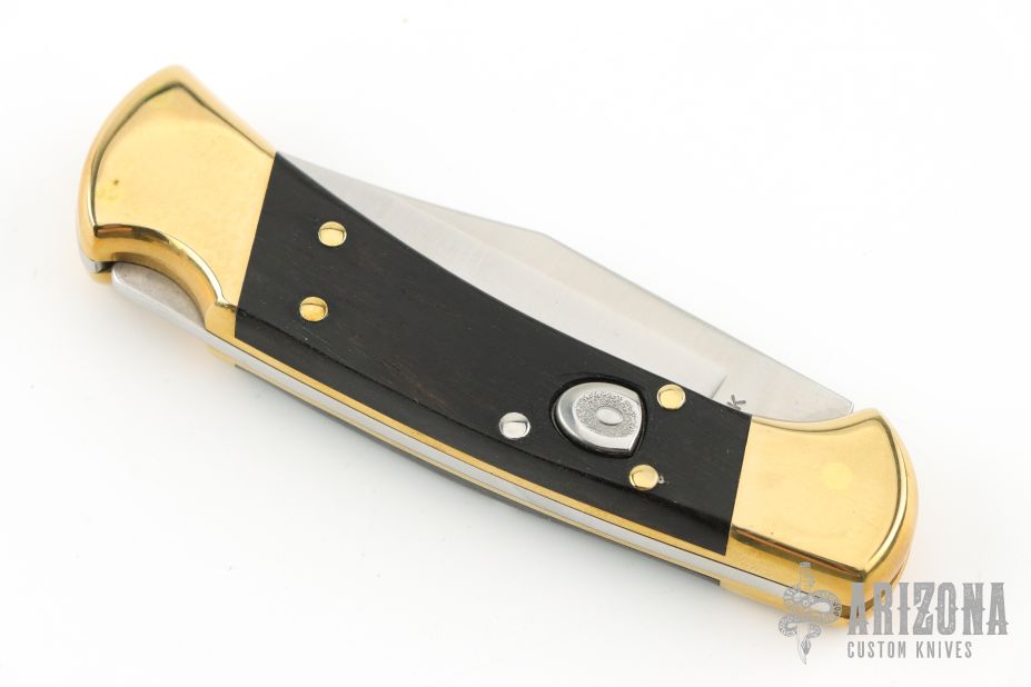 This Buck 112 Auto features a satin finished clip point blade. The handle has a brass frame with wood scales. Comes with original box, papers, and sheath. Has a couple light scuffs, otherwise excellent condition.