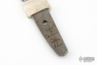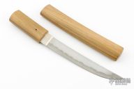This tanto by Francis Boyd features a hand rub satin finished blade with nice hamon, .208" blade stock and 1.190" blade depth, hidden tang construction. The handle has a textured silver habiki, wood grip and saya. Close examination of the blade shows a very fine grain pattern from many fine folds in the steel. Excellent condition. The tang of the blade has his makers mark. Comes with a purple sword bag and a zippered case. Comes with an issue of "The American Blade" Volume II Number 3 from November of 1977. On page 38 there is an article about Francis Boyd, "The Sword-Maker of San Francisco". He made all pieces of this knife (hibachi, blade and shirasaya)