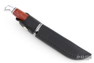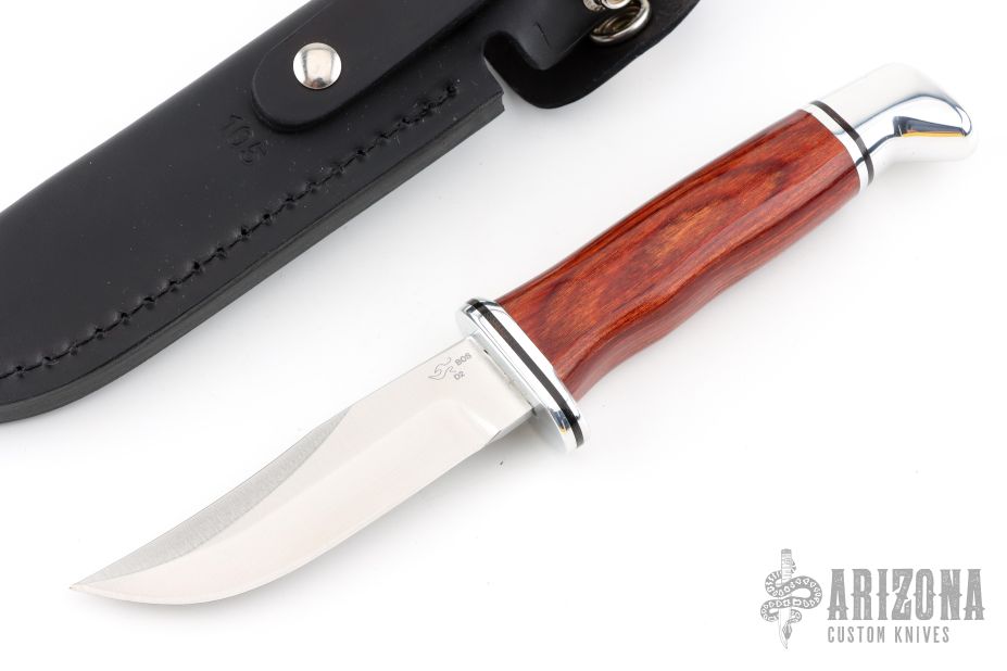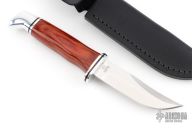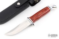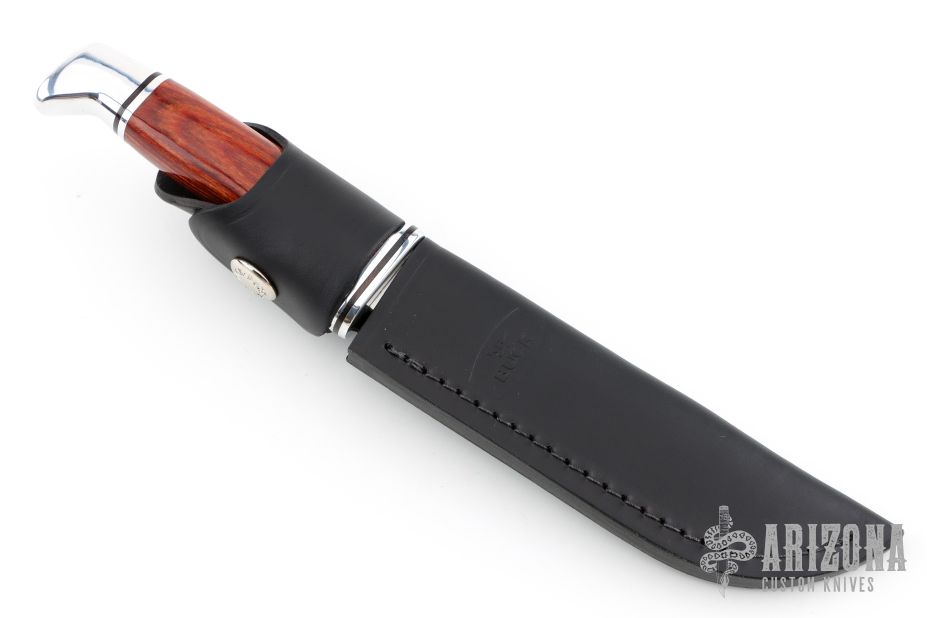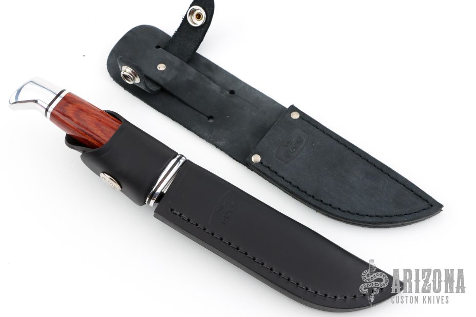 This Model 212 Fixed Ranger by Buck Knives features a satin finished clip point blade with false top edge, .119" blade stock and .894" blade depth, hidden tang construction. The handle has an aluminum guard and butt, and a laminated wood grip. Comes with 2 original black leather sheaths and box. Excellent condition.