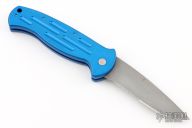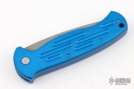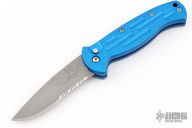 This AFO side opening automatic by Benchmade has a bead blast finished partially serrated blade and rare blue aluminum frame. Has a small black spot on the blade, otherwise excellent condition.