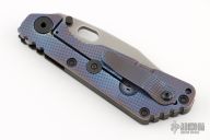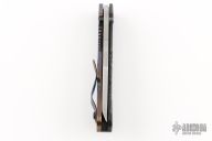 This DDC SNG by Duane Dwyer features a clip point chisel ground blade with thumbhole, and dual thumbstuds. The handle has a chainlink anodized titanium frame with milled black G-10 scale, and anodized titanium tip up clip.  Has some light scuffs, has been resharpened on a Wicked Edge sharpener, otherwise excellent condition. Comes with a camo zippered case and Dwyer patch.