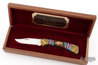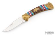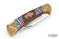 This Buffalo Custom Buck Model 112 has been customized by Brian Yellowhorse. The blades are polish finished with nail nicks. The handle features a brass frame with carved bolsters, with multi-piece scales. Includes original display box and plaque. Excellent condition.
