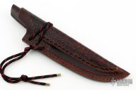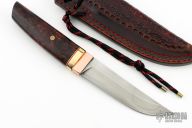 This Kwaiken by Marin Soóš features a hand forged 9XC steel blade with hamon, .194" blade stock and 1.190" blade depth, hidden tang construction. The handle has a copper habiki, brass guard with a red spacer, stabilized maple burl wood grip with a mosaic pin. Comes with a COA dated 6/12/2024. Comes with a hand tooled brown leather sheath and a wooden display stand. New from maker.