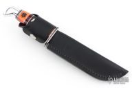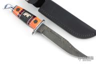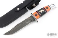 This Model 119 by Buck Knives has been customized by Dave Yellowhorse. It features a carved and distressed finished clip point blade with false top edge and fullers, .114" blade stock and 1.062" blade depth, hidden tang construction. The handle has an aluminum guard and butt, with a multi-piece inlaid grip. Comes with original maroon leather sheath and box. Excellent condition. #7/25