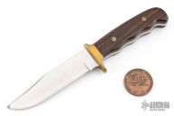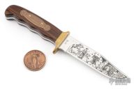 This "Spirit of 76" commemorative knife by Buck features a polished clip point blade with swedge. The handle is comprised of a brass guard and pins with wood scales over full tang construction. The blade has been etched with a scene depicting the Founding Fathers, Paul Revere, The Liberty bell and a Bald Eagle. Medallion inlay on the "B" side of the handle. Number 4272 of 7600. Includes wooden display box and coin. Some light marks on blade but overall great condition. 1.86" blade stock and 1.193" blade depth.