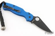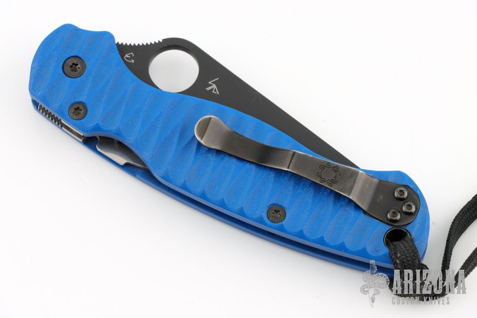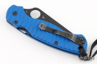 This Paramilitary 2 by Spyderco has a black clip point blade with thumb hole and notched thumb rest. The handle has custom blue G-10 scales with stainless steel liners and black stainless steel tip up clip. Comes with a spyderco bead. Has some light scuffs and wear on the clip, otherwise good condition.