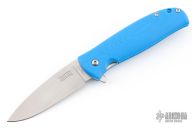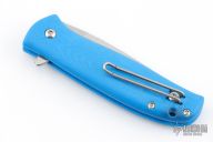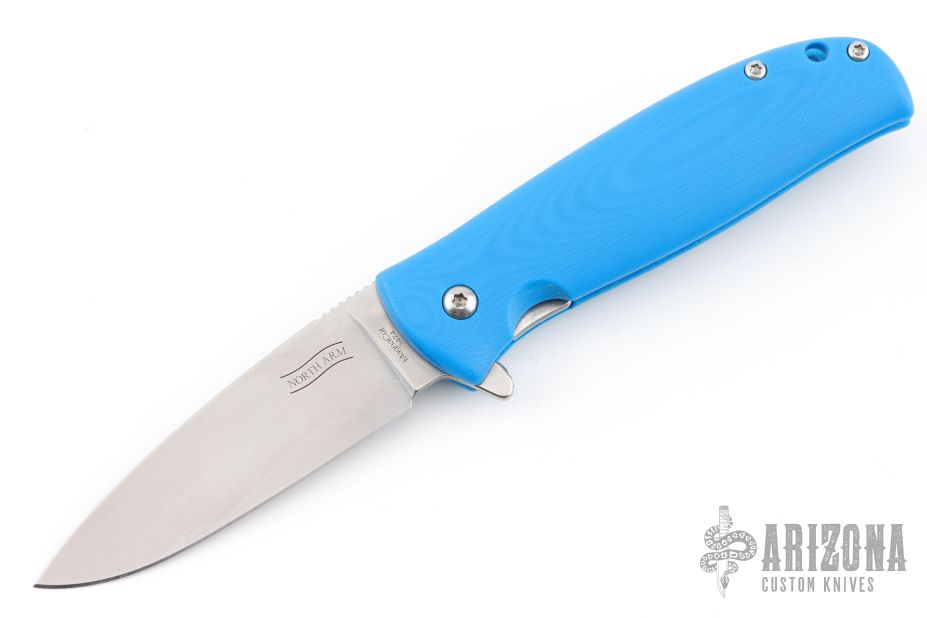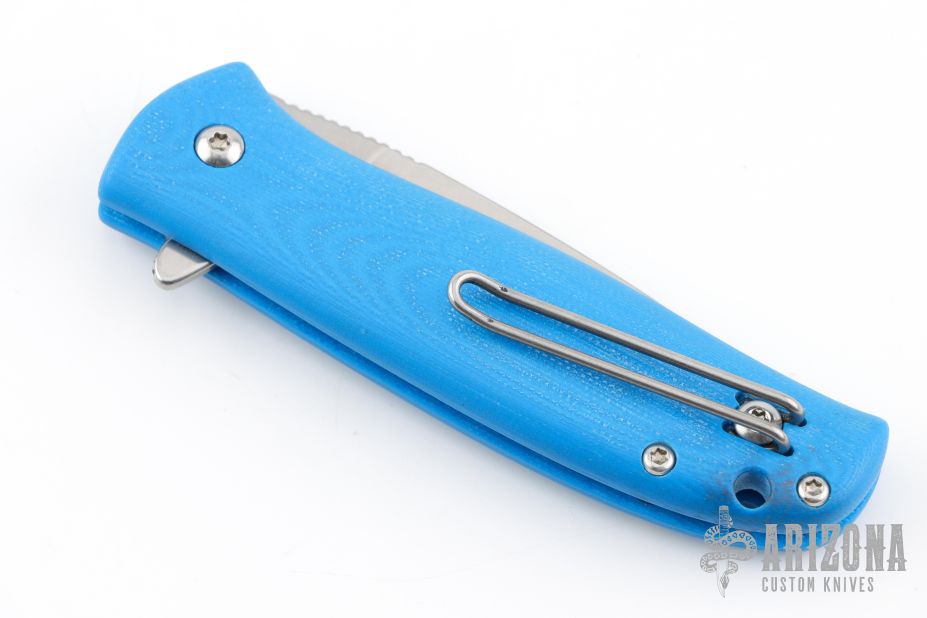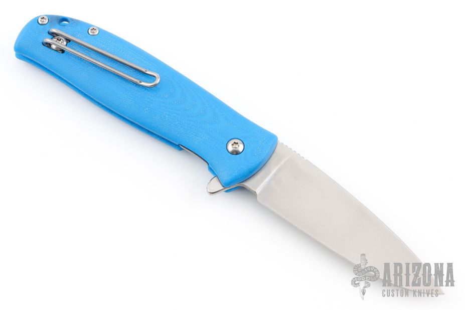 This Skaha By North Arm Knives features a stonewashed drop point blade with notched thumbrest and flipper. The handle has blue G-10 scales with an inlaid stainless steel liner and tip up clip. Rides on bearings, nice detent, lockup and blade seating. Excellent condition.