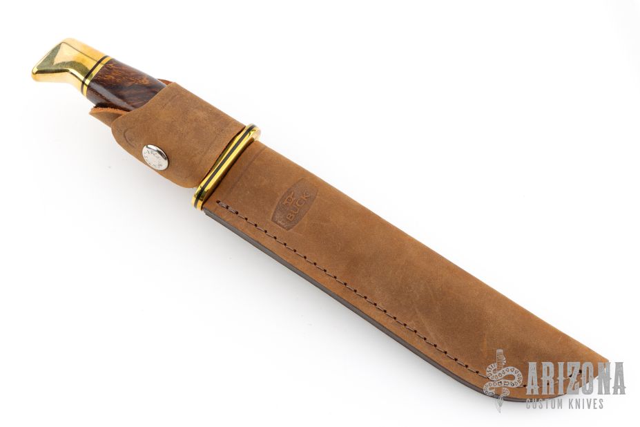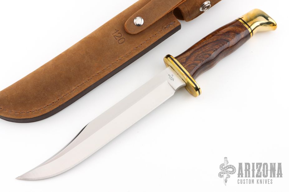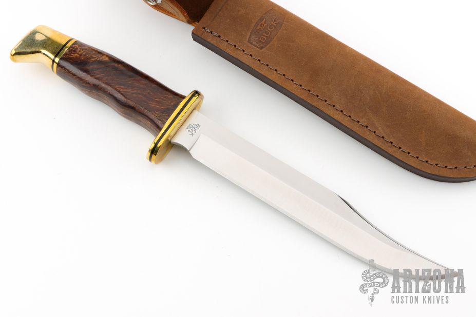 This Model 120 Custom Bowie by Buck Knives features a satin finished clip point blade with false top edge and fullers, .175" blade stock and 1.055" blade depth, hidden tang construction. The handle has an brass guard and butt, and an ironwood grip. Comes with original box, papers, and leather sheath. Excellent condition.