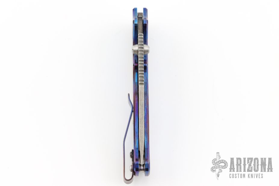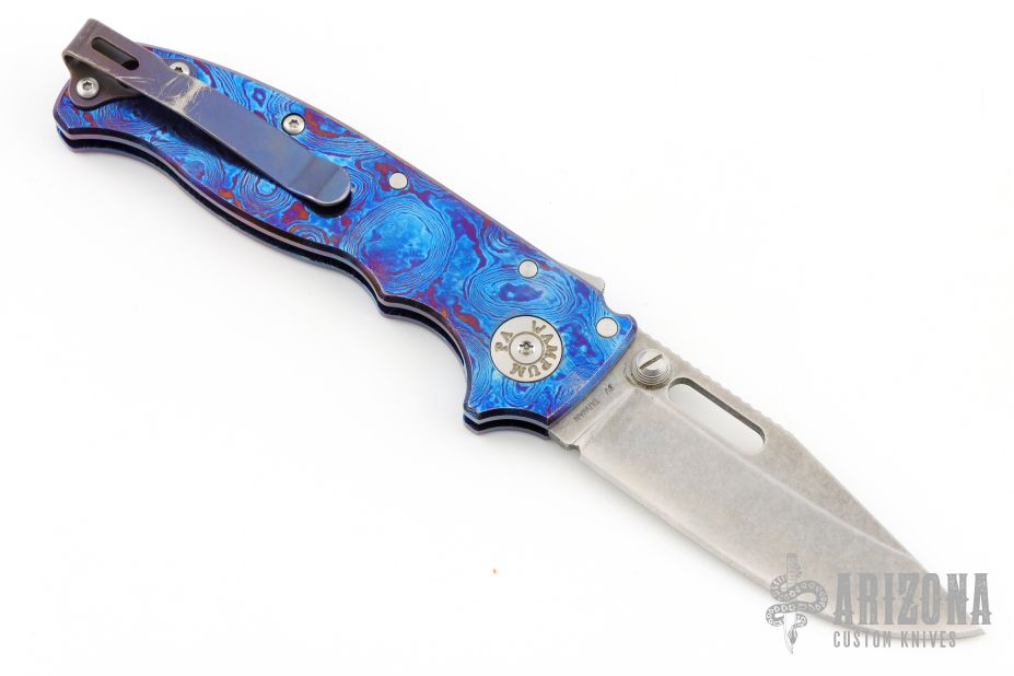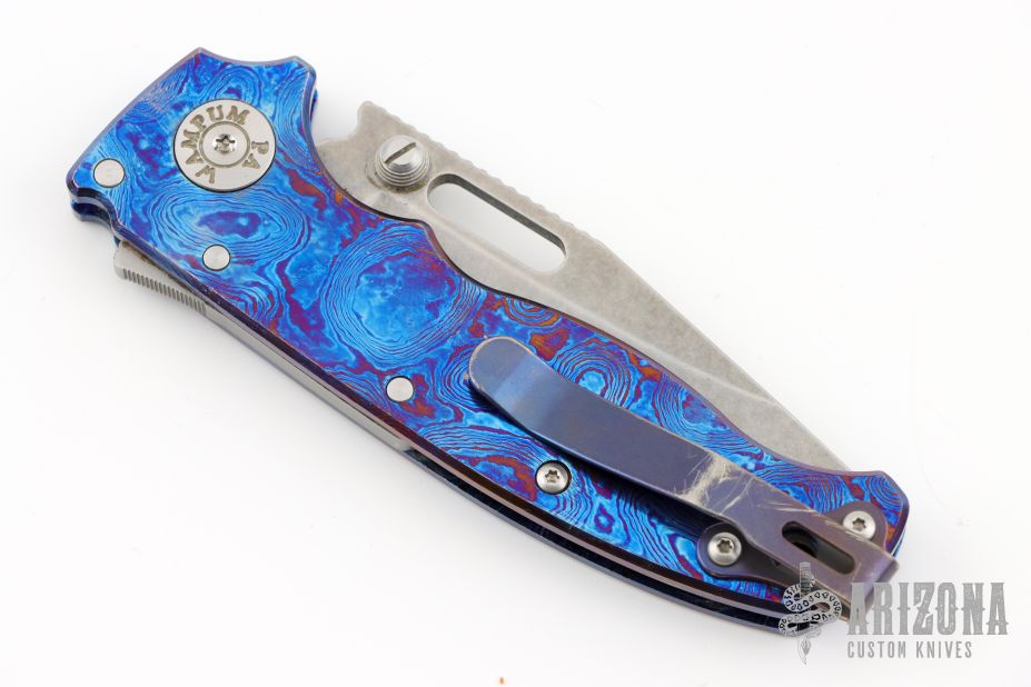 The AD20.5 by Demko Knives features the impressive Shark Lock and an even more impressive price point. The Shark Lock mechanism is situated on the spine of the knife and operated with a ramp-like ‘fin’, allowing you to flip the blade open and closed at will. It's probably the best thing about this knife and design, how quickly it can be deployed and ready for action. It acts as a blade launcher and a little wrist action is all it needs. This knife features a tumbled drop point blade with a notched thumbrest. The handle features a Timascus frame with a steel tip up pocket clip. Comes with original box and extra clip.