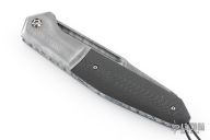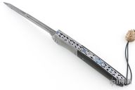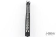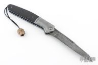 This Ambidextrous Bolster Release Auto by Richard Wright features a Feather Damascus blade with fullers. The handle has fluted Feather Damascus bolsters, carbon fiber scales, satin finished and fileworked titanium liners, carved and anodized titanium backspacer with signify semi-precious gem inlays, inside of backspacer is engraved as well. Bolster release is ambidextrous and works with either bolster. Perfect function and lockup. Excellent work. Comes with zippered case. New from maker!