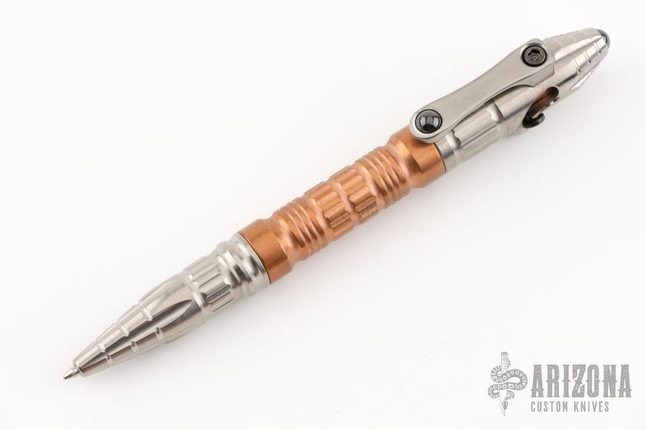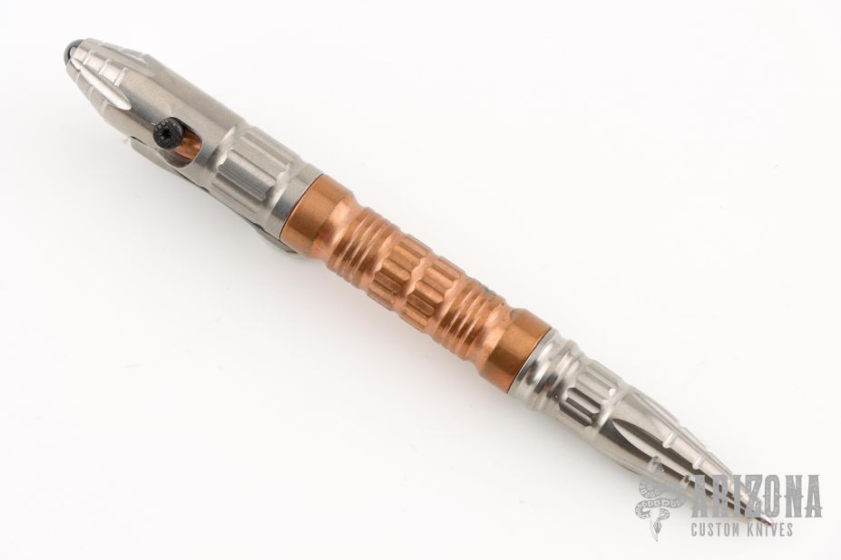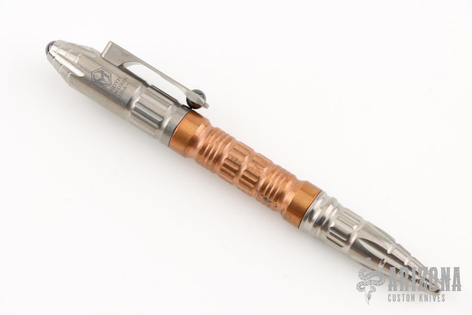 This Thoth Pen by Heretic Knives features stonewashed titanium and copper barrel and fittings. The middle piece can be removed to shorten the pen. Comes with original box. Has some patina on the copper, otherwise excellent condition. S/N0328