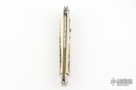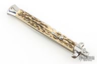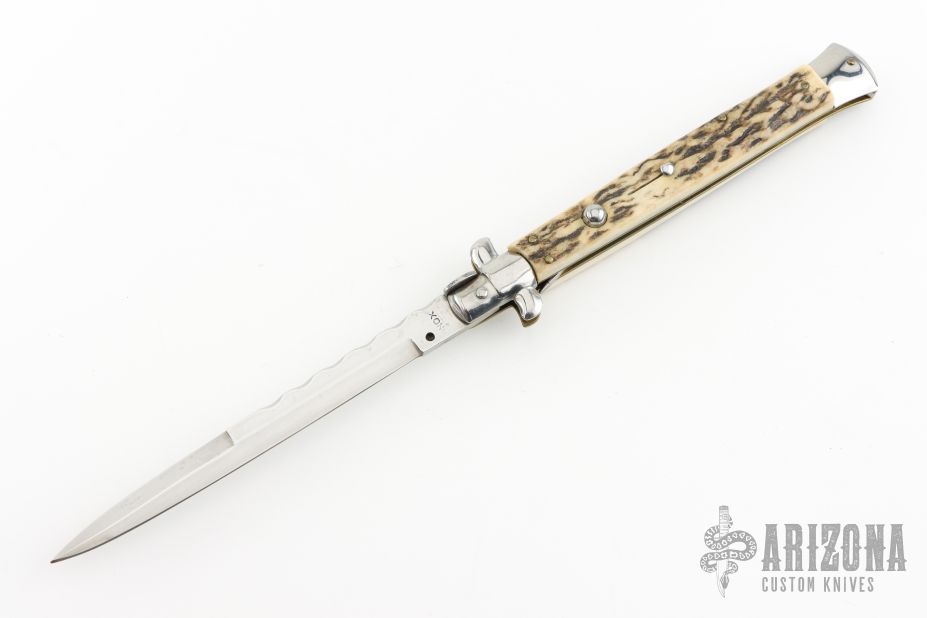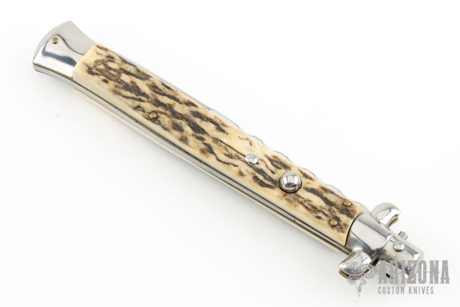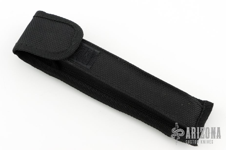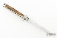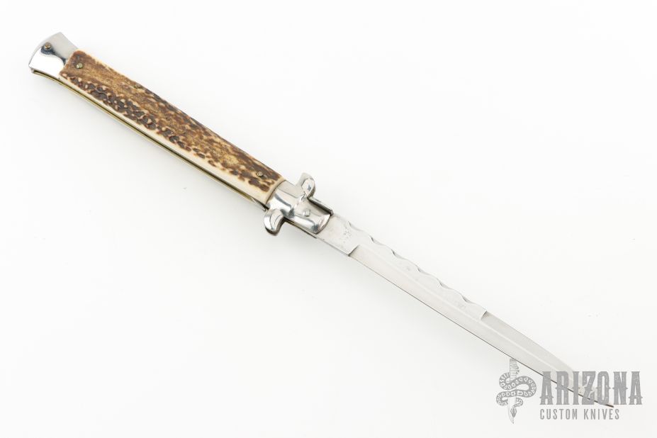 This 13" swivel bolster features a polished satin finished blade with file work on the blade spine. The handle has stainless steel bolsters, front and rear, stag scales, brass liners, stainless spring. Comes in a nylon sheath. Has some light scratches, otherwise excellent condition.