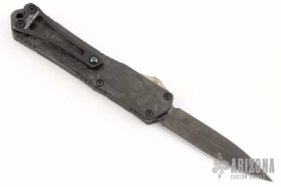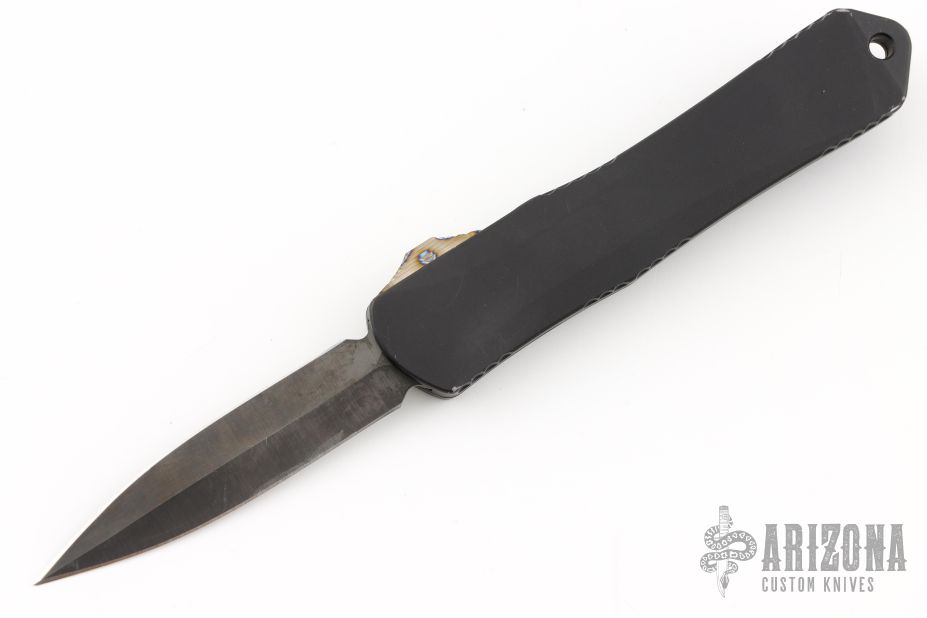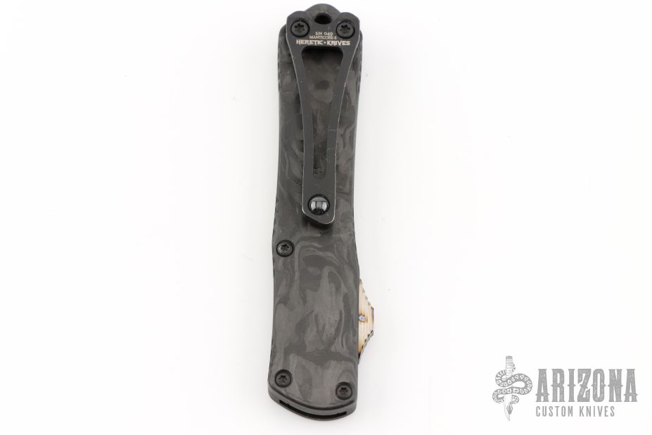 This Manticore-S by Heretic Knives features a black double edge blade.  The handle has a black aluminum frame with marble carbon fiber top, a black titanium tip down clip, flamed titanium thumb slide. Comes in a zipper case. Has scuffs, scratches, and a couple dings in the frame. Good condition/Great user condition otherwise.