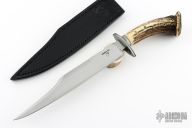 This bowie by David Hammonds features a hand forged hand rub satin finished blade with sharpened top edge, .217" blade stock and 1.325" blade depth, hidden tang construction. The handle has a fluted wrought iron guard and collar, crown stag grip with brass pins. Comes with a hand tooled black leather sheath. Has some light scratches, otherwise excellent condition.