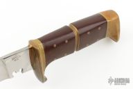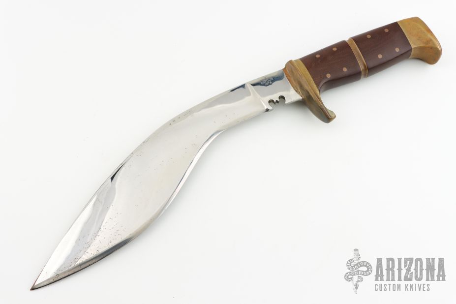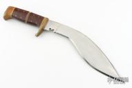 This early Kukri by Jody Samson features a mirror finished blade with .224" blade stock and 2.383" blade depth, hidden tang construction. The handle has brass guard and butt with a brown canvas micarta grip, fluted brass spacer and brass pins. Has some patina spots on the blade and brass, otherwise excellent condition for its age.