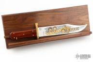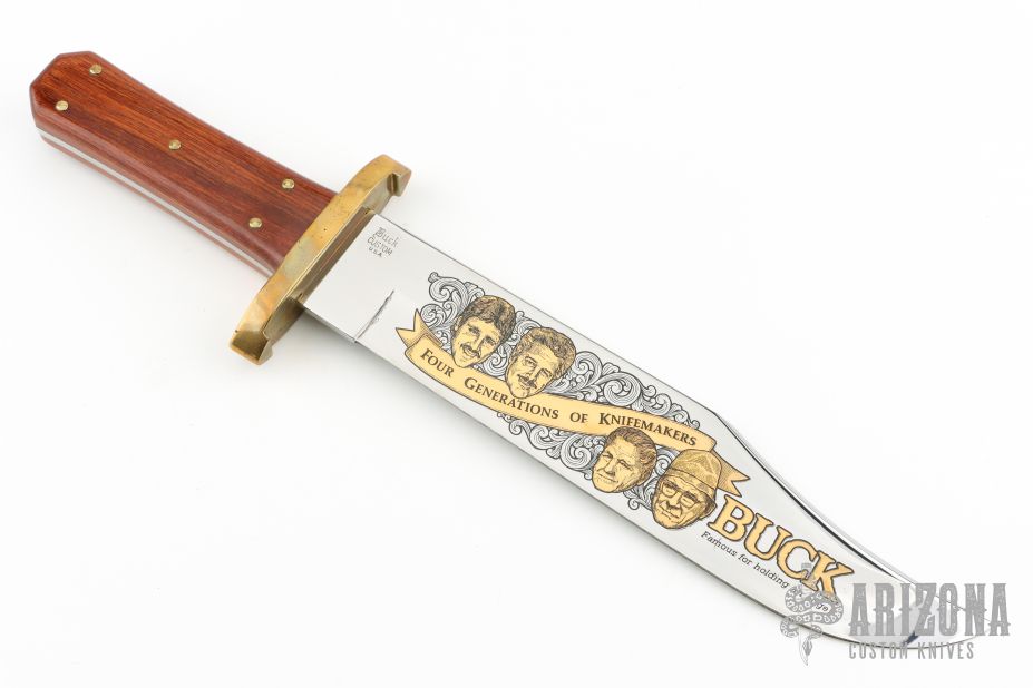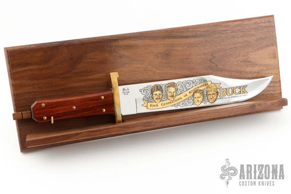 This bowie by Buck Knives features a mirror polished blade with a scene of "Four Generations of Knifemakers" etched into the blade, false top edge, .178" blade stock and 1.961" blade depth, full tang construction. Comes with a wooden display stand and original box. Excellent condition. #78 of 1500