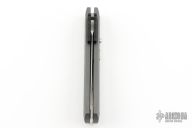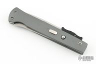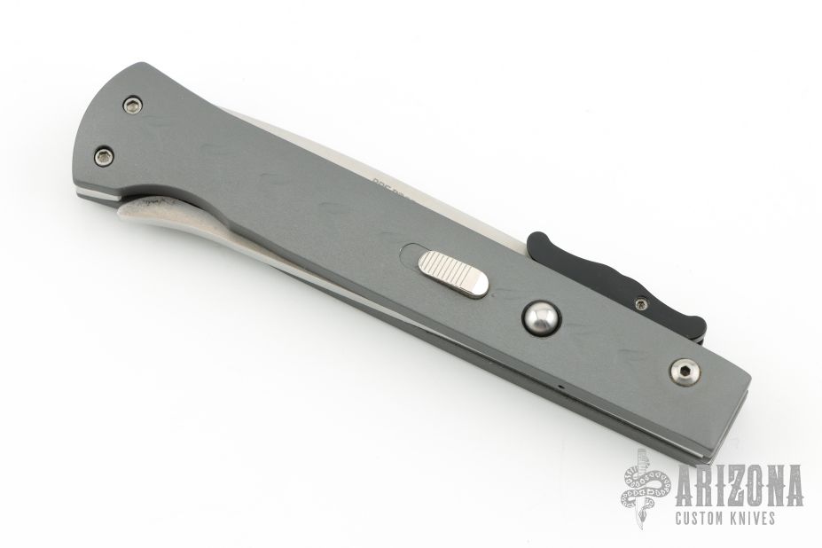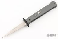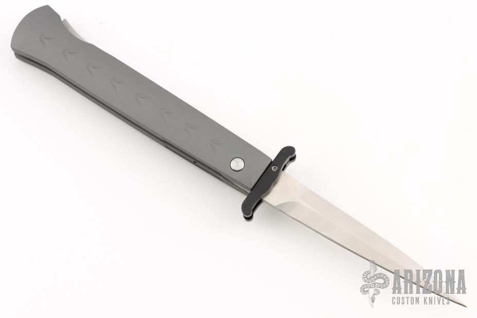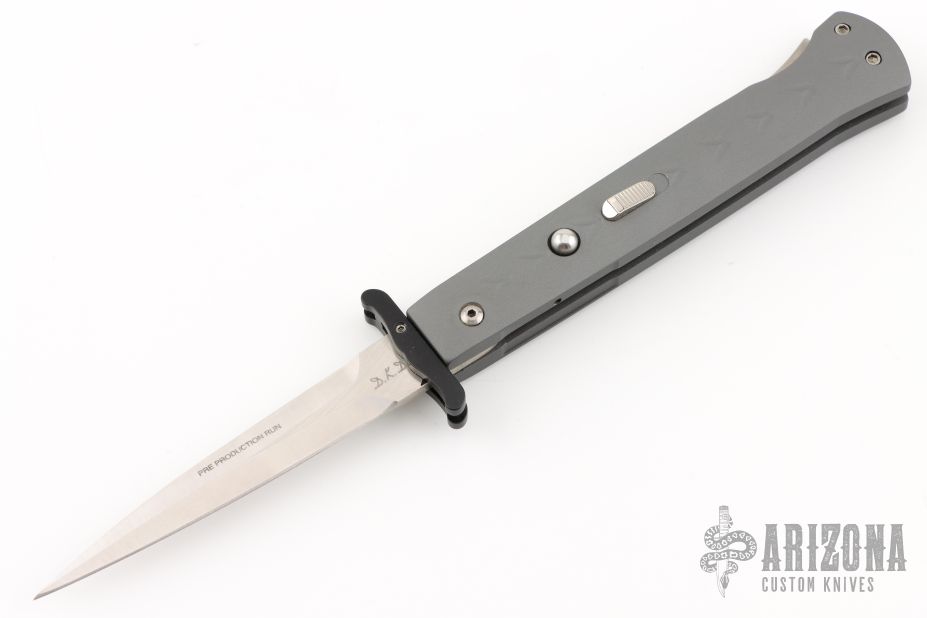 This Phantom Italian swing guard automatic by Dynamic Knife Designs has a satin finish blade and gray aluminum handle. Features a ramped side positioned stainless steel safety just below the firing button. False top edge. Button release/single action with closure via the rear positioned lockbar release. Dual leaf and coil spring action providing an extremely fast opening. When closed, the dual guard rests on the frame, encompassing the blade tang. Upon opening, the guard swings into a locked position. Has a couple light scuffs and scratches, otherwise excellent condition.